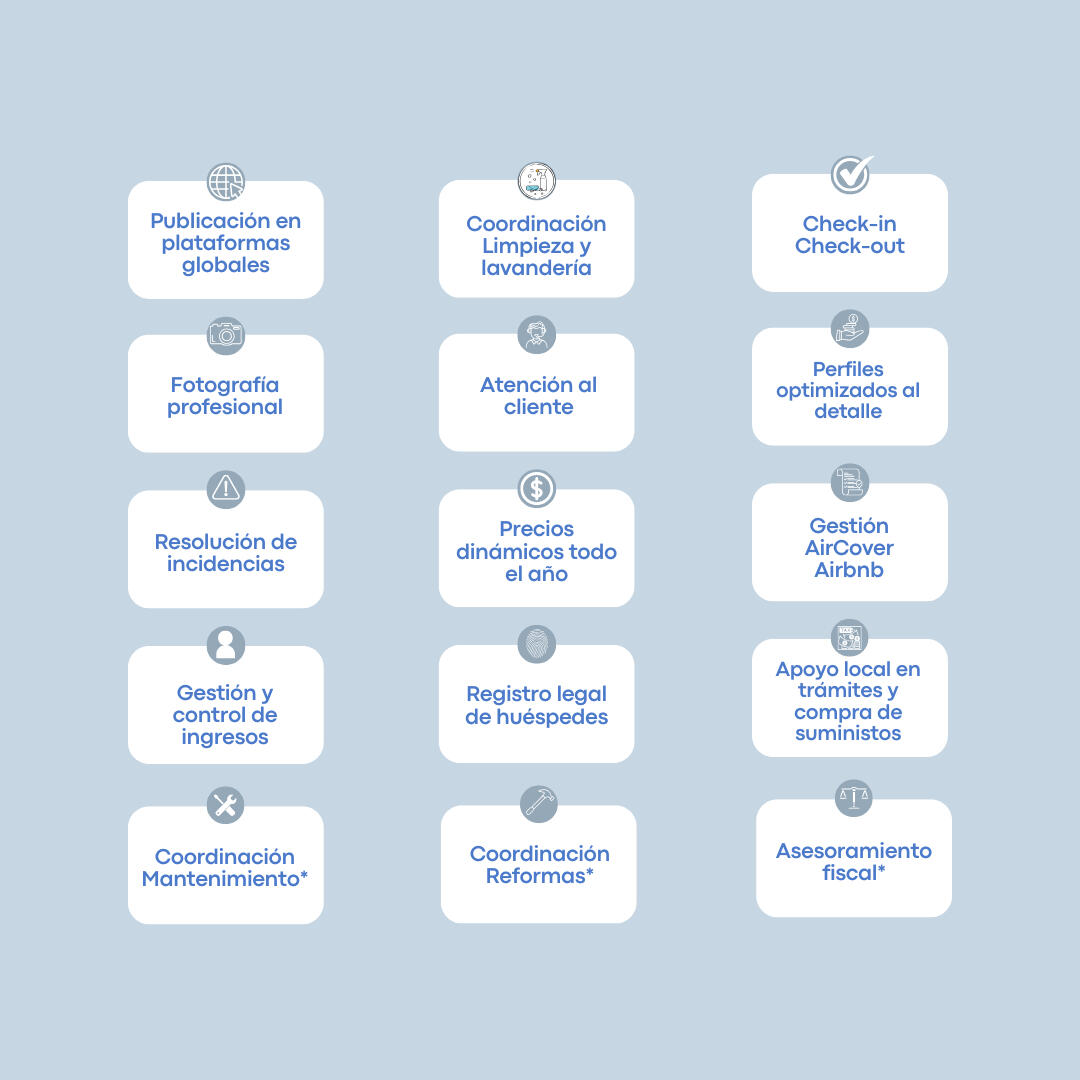 Maximiza el potencial de ingresos de tu propiedad cada mes.Con total tranquilidad y el respaldo de un equipo profesional que cuida cada detalle.Coordinamos todos los aspectos necesarios para el correcto funcionamiento de tu vivienda vacacional, para que tú puedas despreocuparte del día a día.